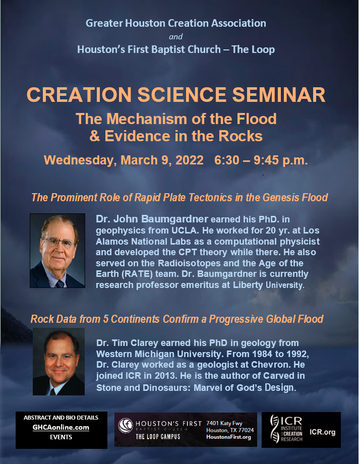 We will contrast conventional slow and gradual plate tectonics with the Catastrophic Plate Tectonics presented by geoscientist Drs. Baumgardner and Dr Clarey. We will look at the specific evidences that indicate that this episode of CPT did in fact happen and that it was only a few thousand of years ago. We will also consider the evidence that all of the fossil bearing rock layers were laid down during the episode of CPT that also replaced all of the ocean floor rocks. We will also compare all of this with the conventional view of plate tectonics that asserts that hundreds of millions of years are required for these same changes to take place. We will seek to place all of this in a clear context that all can understand in a basic way. We will also present clear evidence on the critical issues other geoscientists are likely to question. This will be a fun and enlightening discussion for all.